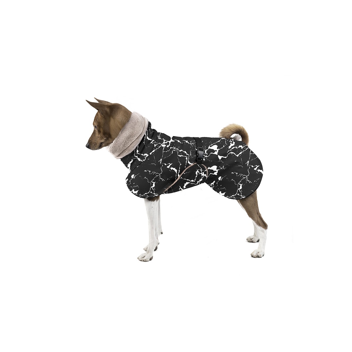 Enji Bunda je příjemná a funkční softshellová bunda navržena pro plemeno basenji, která ochrání vašeho pejska před nepříznivým počasím. Bunda je vhodná do zimního počasí, je nepromokavá a dobře se udržuje. Zapínání na přezku pokračuje ze spodní části oblečku a tak skvěle zakrývá hrudník. Zadní část je vykrojená pro nonstop zvednutý ocas. Délka bundy je o +-2 cm delší jak délka zad psa (z důvodu pohybu psa).