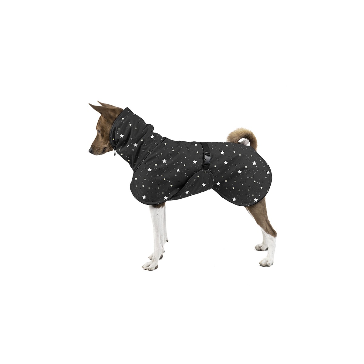 The Enji Jacket is a pleasant and functional softshell jacket designed for the Basenji breed, which will protect your dog from bad weather. The jacket is suitable for winter weather, it is waterproof and easy to maintain. The buckle closure continues from the bottom of the dress and thus perfectly covers the chest. The back is cut out for a non-stop raised tail. The length of the jacket is +-2 cm longer than the length of the dog's back (due to the dog's movement).